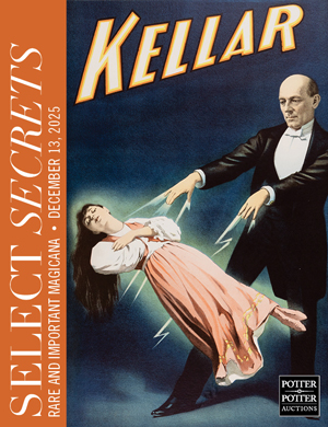 Potter & Potter's final magic auction of the year will feature a closely-curated selection of magicana from the art's golden age and beyond. This "best of the best" offering features rare Kellar, Thurston, and Goldin lithographs - some coming to the market for the first time - alongside memorabilia from Harry Houdini's career and his family's scrapbooks, choice micro-magic effects, early printed books on conjuring, and relics from the Maskelyne dynasty of magicians. Costumes from the careers of Cardini and De Biere, apparatus owned and used by Dai Vernon, Floyd Thayer's own scrapbooks, and autographed editions of collectible classics will also cross the block.
